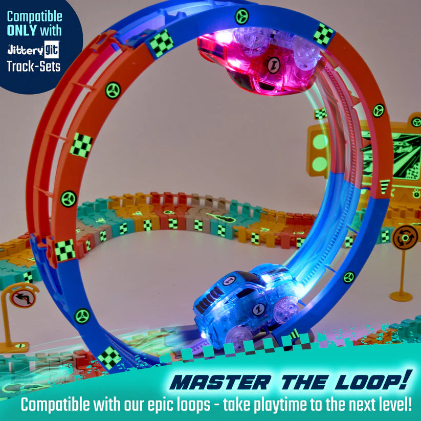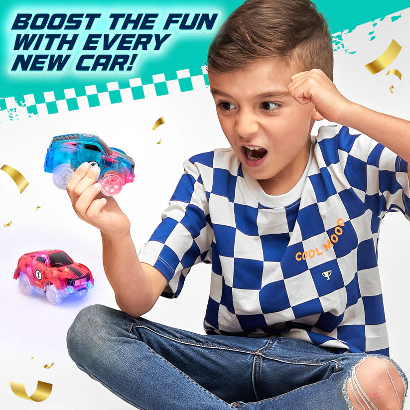 Take your racetrack fun to the next level! These durable, battery-powered mini trucks light up, glow, and race through loops, tunnels, and ramps for nonstop action. With replaceable tires, vibrant decals, and a rugged design, they’re perfect for boys and girls who love speed, STEM play, and exciting challenges - indoors or outdoors.